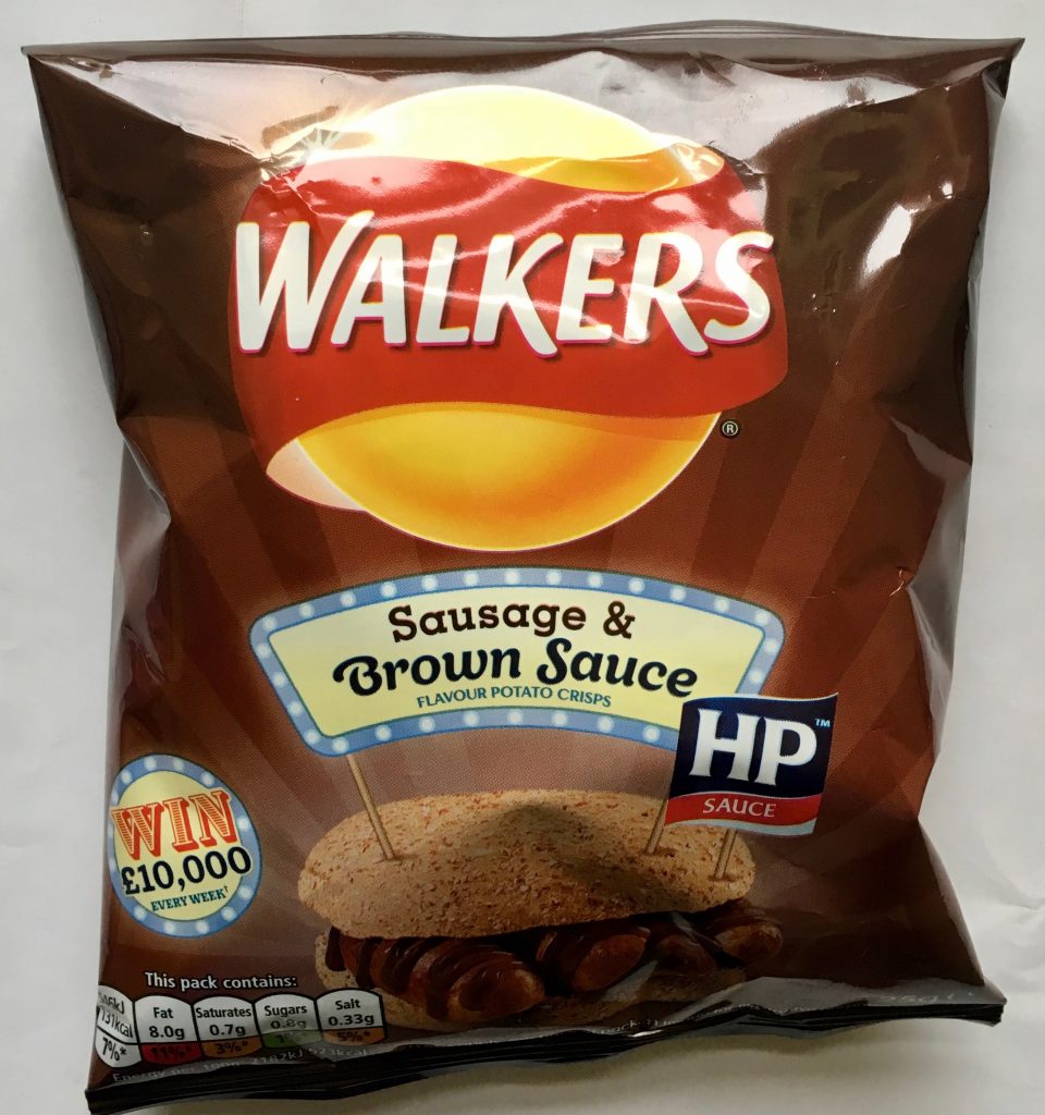 Walkers macht wirklich viele Crossbrands (sehr vernünftig), diese Chips sind mit HP-Sauce und heißen „Würstchen mit brauner Soße“ – toll, Engländer müsste man sein!