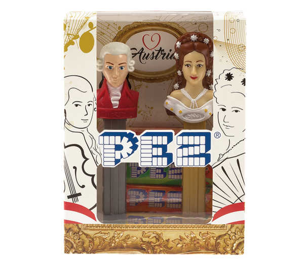 PEZ-Spender von Wolfgang Amadeus Mozart und Kaiserin Sisi in einer Schmuckdose