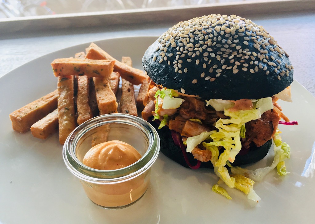 Hermanns Berlin-Mitte Jackfruit-Burger aus Pulled Jackfruit auf Aktivkohle-Dinkel-Brötchen mit Coleslaw-Kichererbsen-Pommes und Cashew-Mayonnaise