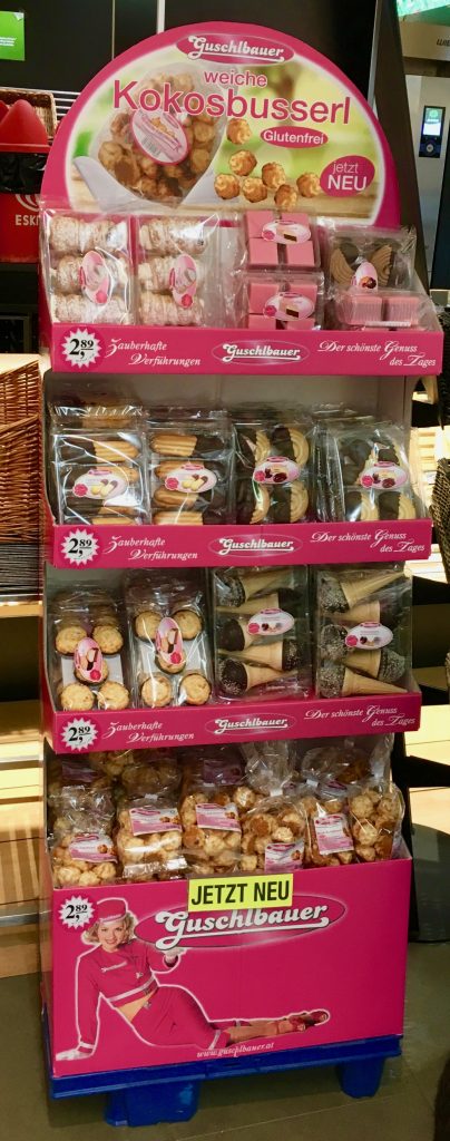 Guschlbauer Backwaren Zweitplatzierung POS Ein in Pink gehaltener Aufsteller des österreichischen Unternehmens Guschlbauer mit diversen Backspezialitäten, darunter Kokosbusserln. Österreich Guschlbauer Backwaren Zweitplatzierung POS Wenn Sie einen Rechtschreibfehler gefunden haben, benachrichtigen Sie uns bitte, indem Sie den Text auswählen und dann Strg + Eingabetaste drücken.