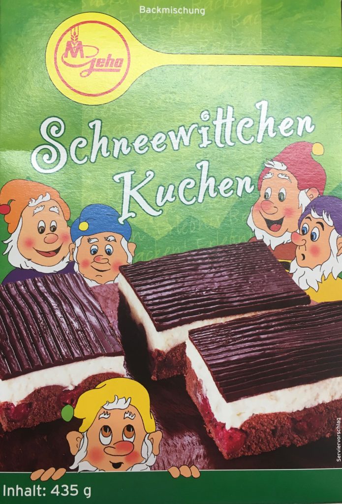 Der Geha Schneewittchen-Kuchen hat drei Schichten: eine blutrote Kirschfüllung, Creme so weiß wie Schnee und eine Schokoladen-Decke so schwarz wie Ebenholz. Donauwelle eben. Hier das alte Verpackungsdesign.