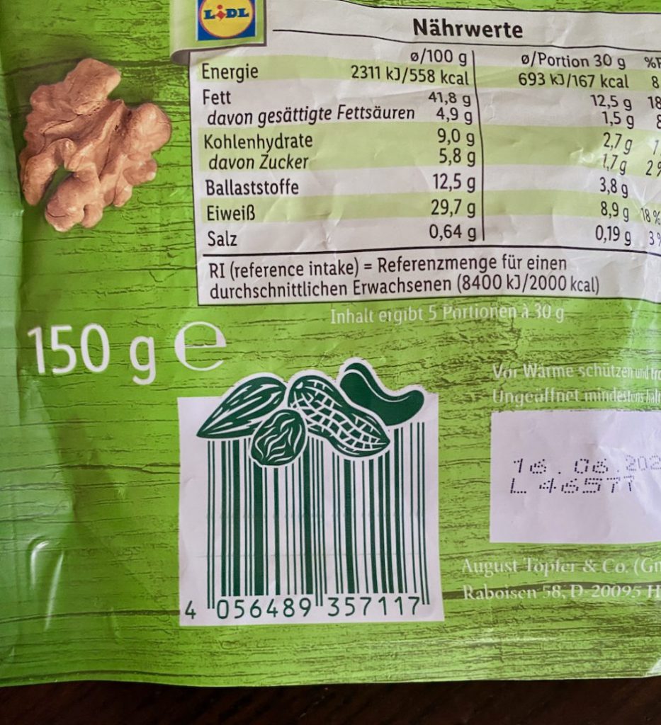 Lidl Alesso Nussischung barcode mit Nüssen Lidls Eigenmarke für Nüsse, Allesso, nutzt dieselbe Strichcodeverzierung für verschiedene Sorten seiner Nussmischungen. Lidl Alesso Nussischung barcode mit Nüssen Wenn Sie einen Rechtschreibfehler gefunden haben, benachrichtigen Sie uns bitte, indem Sie den Text auswählen und dann Strg + Eingabetaste drücken.